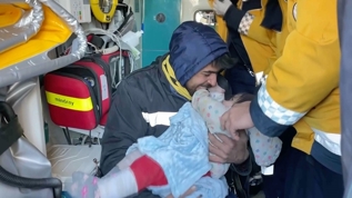 Deprem günü enkaz altından kendi imkanlarıyla çıkan ve 55 saatlik umutlu bekleyişin ardından bebeğine kavuşan baba Ömer Kıraççakalı, ambulansa alınan bebeğine sarılarak, büyük mutluluk yaşadı.
