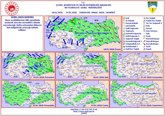 18 Ocak 2026 Pazar günlük hava durumu: Meteoroloji Genel Müdürlüğünden alınan tahminlere göre, yurdun genelinin parçalı ve çok bulutlu, Marmara'nın doğusu, İç Anadolu'nun doğusu, Karadeniz, Doğu ve Güneydoğu Anadolu, Ankara ve Çankırı çevreleri ile Kırklareli'nin kıyı, Çanakkale'nin doğu kesimlerinin karla karışık yağmur ve kar yağışlı, Hatay çevrelerinin yağmurlu geçeceği tahmin ediliyor.