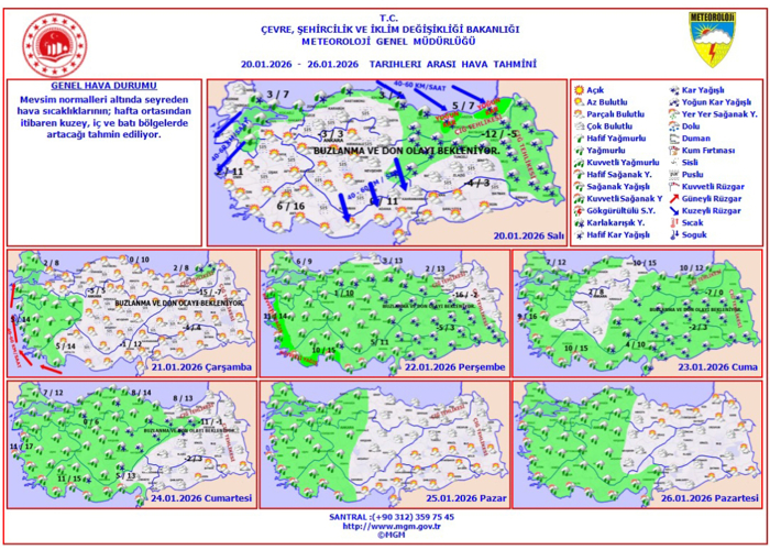 20 Ocak 2026 Salı günü için Meteoroloji Genel Müdürlüğü tarafından yapılan tahminlere göre: Ülkemiz genelinin parçalı ve çok bulutlu, İstanbul, Sakarya, Kocaeli çevreleri, Çanakkale'nin doğusu, Balıkesir'in kuzeyinin yağmurlu; Batı ve Orta Karadeniz kıyılarının karla karışık yağmurlu; Doğu Karadeniz, Bilecik, Sivas, Kayseri, Tokat, Erzincan, Kars, Ardahan, Iğdır, Ağrı, Bitlis, Van, Hakkari çevreleri ile Erzurum'un kuzey ve doğusu ile Muş'un doğu kesimlerinin kar yağışlı geçeceği tahmin ediliyor. Yağışların; Giresun'un doğusu, Trabzon'un batısı, Rize ve Artvin çevrelerinde yoğun kar şeklinde olması bekleniyor. Rüzgarın; Marmara'nın güneybatısı, Kuzey Ege kıyıları, Orta ve Doğu Karadeniz kıyıları, İç Anadolu'nun güneydoğusu ile Doğu Akdeniz'in iç kesimlerinde kuzeyli yönlerden kuvvetli olarak (40-60 km/saat) esmesi bekleniyor. Gece ve sabah saatlerinde iç ve doğu bölgelerde buzlanma ve don birlikte pus ve yer yer sis bekleniyor. Doğu Karadeniz'in iç kesimlerinin yüksekleri ile Doğu Anadolu'nun doğusunda yüksek kar örtüsüne sahip eğimli kesimlerinde çığ tehlikesi bulunmaktadır.