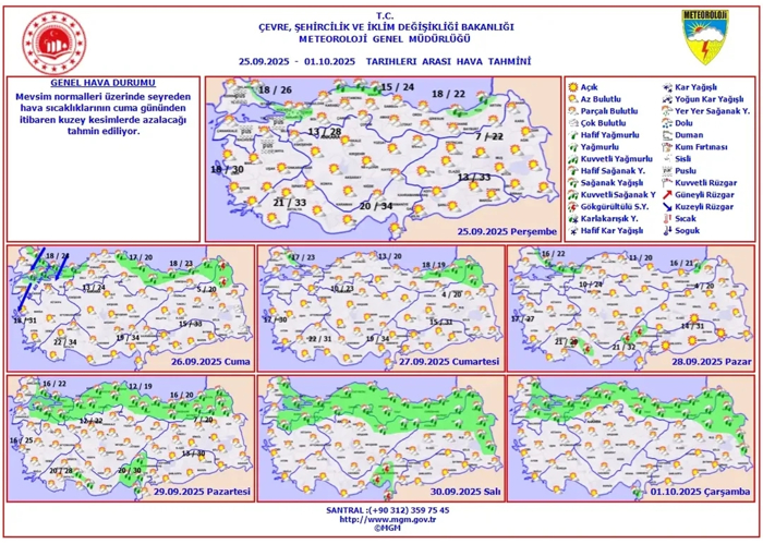 25 Eylül 2025 Perşembe (bugün) için Meteoroloji Genel Müdürlüğü tarafından yapılan tahminlere göre: Ülkemizin kuzey kesimlerinin parçalı, yer yer çok bulutlu, Marmara'nın kuzey kıyıları ile Düzce, Sinop, Trabzon, Rize çevreleri, Samsun, Kastamonu ve Artvin kıyılarının yerel olmak üzere sağanak yağışlı, diğer yerlerin az bulutlu ve açık geçeceği tahmin ediliyor. Sabah ve gece saatlerinde Marmara'nın doğusu ile Karadeniz'in iç kesimlerinde pus ve yer yer sis bekleniyor.HAVA SICAKLIĞI: Hava sıcaklığının, Karadeniz'in iç kesimlerinde 2 ila 5 derece azalacağı, diğer yerlerde önemli bir değişiklik beklenmiyor.