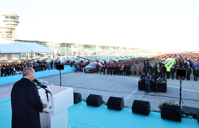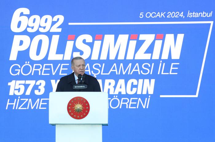 Atatürk Havalimanı'nda 6992 polisin göreve başlaması ve 1573 yeni aracın hizmete alım töreninde konuşan Cumhurbaşkanı Erdoğan, kentte emniyete ait araç ve personel sayısına ilişkin bilgi verdi.