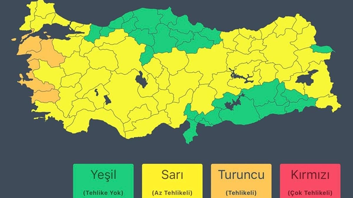 Açıklamada, bugün 52 il için gök gürültülü sağanak, kuvvetli rüzgar ve fırtına sebebi ile "sarı" meteorolojik uyarı, Aydın, Çanakkale, Balıkesir, İzmir için de gök gürültülü sağanak nedeniyle "turuncu" meteorolojik uyarı yapıldığı ifade edildi.