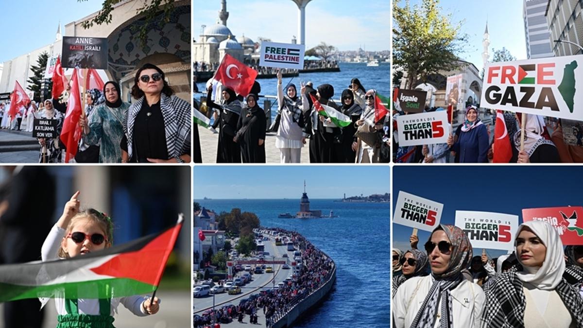Etkinlik için ellerinde Türk ve Filistin bayraklarıyla Cedidiye Meydanı'nda toplanan kadınlar, daha sonra otobüslerle Anıtpark Meydanı'na geldi.