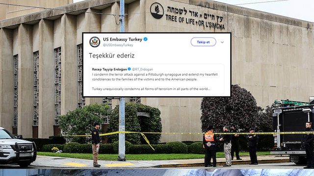 ABD'nin Ankara Büyükelçiliği, ABD'de 11 kişinin hayatını kaybettiği sinagog saldırısı için İngilizce taziye mesajı yayınlayan Başkan Erdoğan'a Twitter'dan Türkçe cevap verdi.