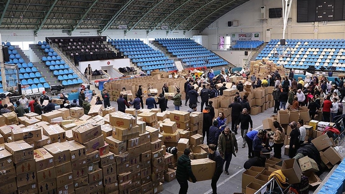 Özgür, Mimar Sinan Spor Salonu'ndaki yardım noktasına gıda ve giyecek yardımı getirdi, burada yardımların paketlenmesine de yardımcı oldu.