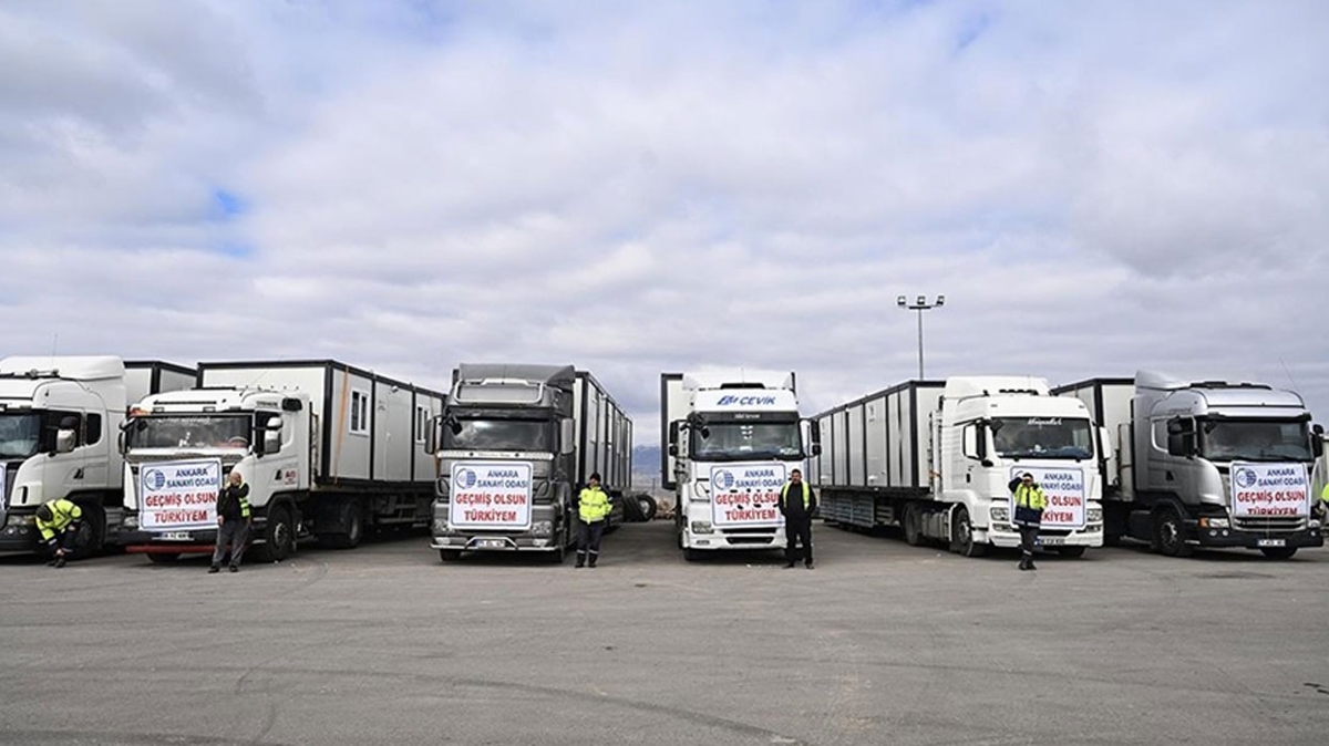 Ankara Sanayi Odası (ASO) 2. ve 3. Organize Sanayi Bölgesi'nde yer alan bir firmanın ürettiği konteynerleri taşıyan 32 tır, Oda tarafından Hatay'da kurulacak "yaşam merkezi"ne ulaştırılmak üzere hareket etti.