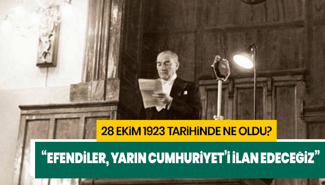 Atatürk'ün "Efendiler, yarın cumhuriyeti ilan edeceğiz" konuşması arama motorlarında yoğun olarak araştırılıyor. 29 Ekim'den bir gün önce Mustafa Kemal Atatürk bir toplantı yaparak, oradaki insanlara seslendi ve 'Efendiler yarın cumhuriyeti ilan edeceğiz' demişti. 28 Ekim 1923 akşamı Çankaya Köşkü’nde yapılan bu toplantıda Atatürk'ün söyledi sözler, tarihte altın harflerle yazıldı. Yarın Cumhuriyet'in 96. yıldönümünü kutlayacağız. Bugün ise Atatürk'ün "Efendiler, yarın cumhuriyeti ilan edeceğiz" konuşmasını yapalı tam 96 yıl oldu. Atatürk'ün Efendiler, yarın cumhuriyeti ilan edeceğiz konuşması ve Atatürk resimleri haberimizde yer alıyor..