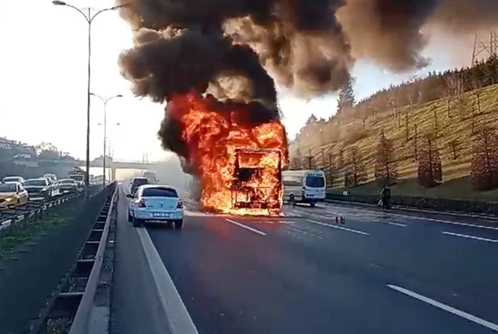 Hatay'dan Çorlu'ya seyir halindeki şehirler arası yolcu otobüsünde, TEM Otoyolu Bağcılar mevkisinde henüz belirlenemeyen nedenle yangın çıktı. 24 yolcunun indirildiği otobüsü duman ve alevler sardı.