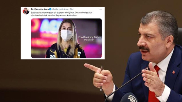Koca, paylaşımında, "Sağlık çalışanlarımızdan bir bayram tebriği var. Onların bu fedakar cümlelerine kulak verelim. Bayramımız kutlu olsun." ifadelerini kullandı.