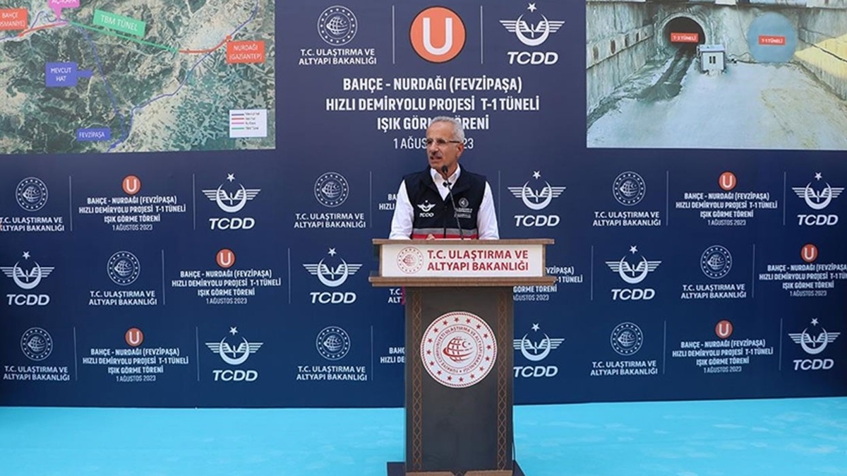 Ulaştırma ve Altyapı Bakanı Abdulkadir Uraloğlu, Gaziantep'in Nurdağı ilçesinde yapımı süren Bahçe-Nurdağı (Fevzipaşa) Varyantı Demir Yolu Tüneli Işık Görme Töreni'ne katıldı.