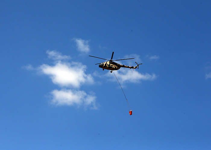 Ekiplerin gece boyu karadan yürüttüğü çalışmalara günün ağarmasıyla helikopterlerle destek verilmeye başlandı.