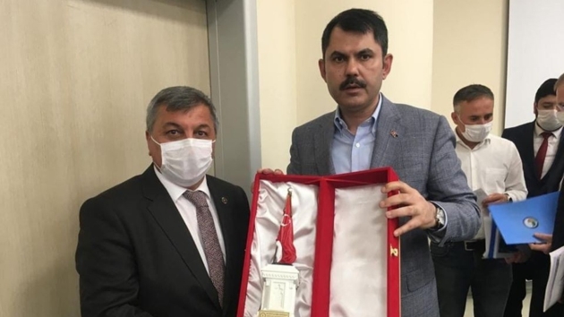 Başkan Arif Teke'den Bakan Kurum'a Şehit Sancaktar Anıtı biblosu hediyesi