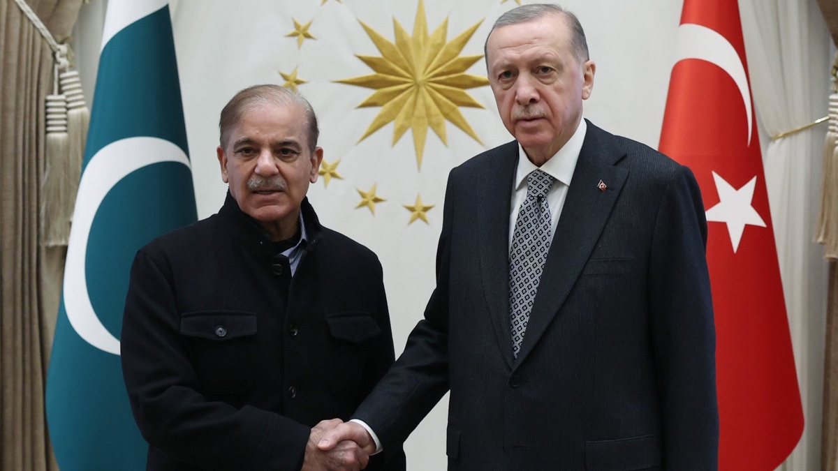 Başkan Recep Tayyip Erdoğan, Pakistan Başbakanı Şahbaz Şerif'i Cumhurbaşkanlığı Külliyesinde kabul etti.