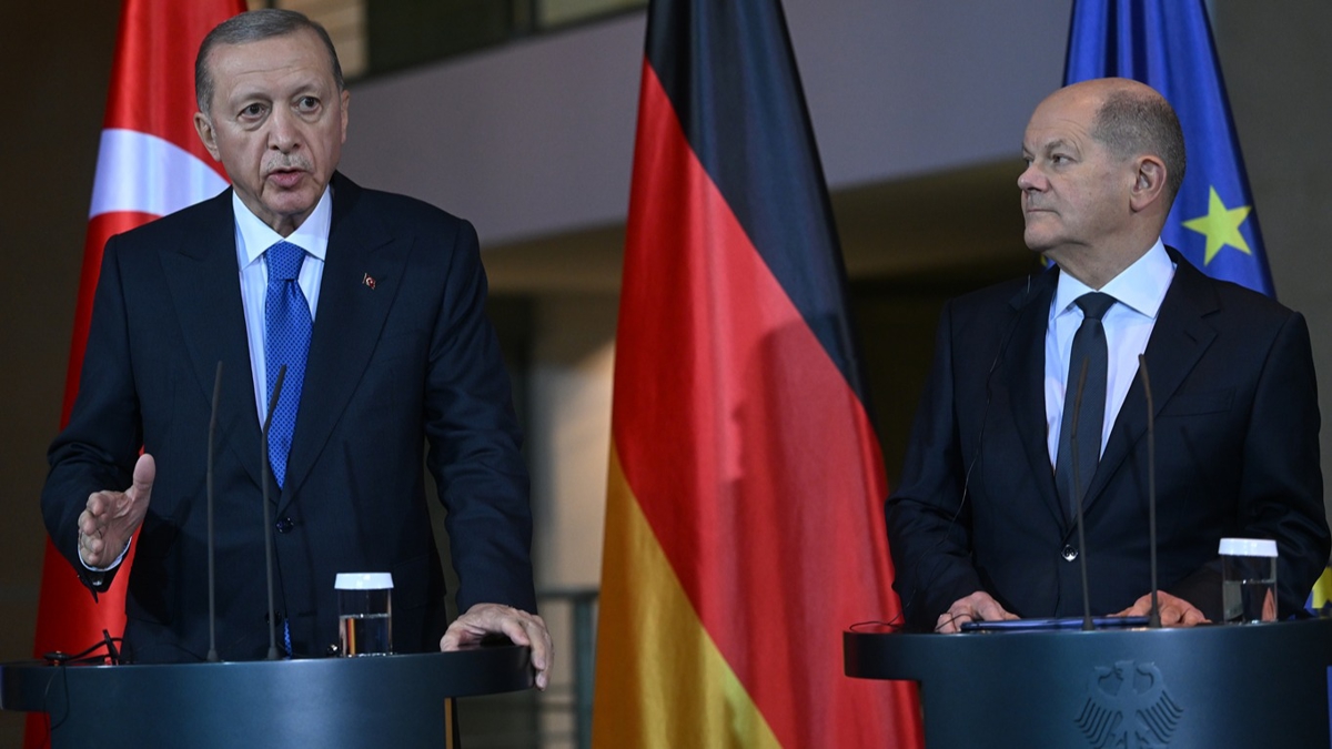 Erdoğan, Almanya Başbakanı Olaf Scholz ile baş başa görüşme ve heyetler arası çalışma yemeği öncesinde ortak basın toplantısı düzenledi.