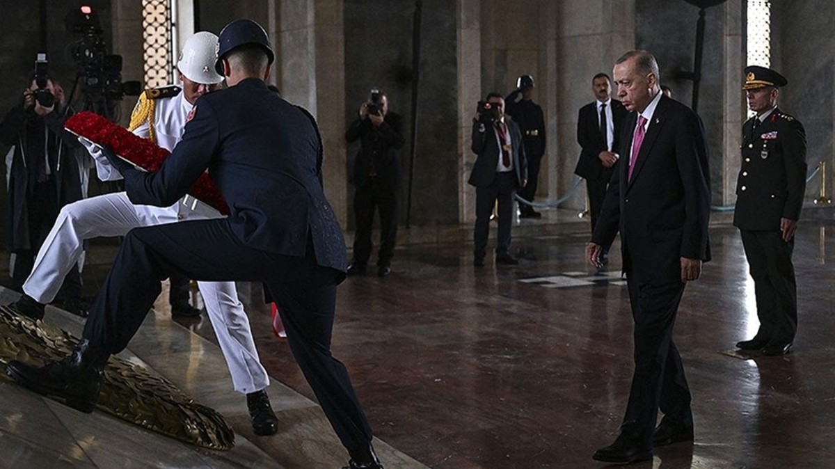 Aslanlı Yol'dan yürüyerek Atatürk'ün mozolesine çıkan Erdoğan'a, Ankara Valisi Vasip Şahin, Cumhurbaşkanlığı İletişim Başkanı Fahrettin Altun, Cumhurbaşkanlığı Özel Kalem Müdürü Hasan Doğan ile Cumhurbaşkanlığı İdari İşler Başkanı Metin Kıratlı eşlik etti.