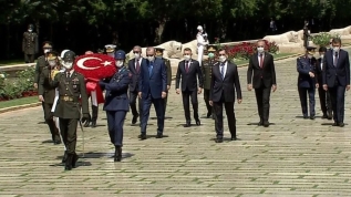 Başkan Erdoğan'ın ay yıldız motifli çelengi Atatürk'ün mozolesine bırakmasının ardından saygı duruşunda bulunuldu, İstiklal Marşı okundu.