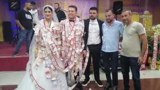 Manisa'da gelin ve damada 5 liralık banknotlardan oluşan 45 metrelik para zinciri takıldı.