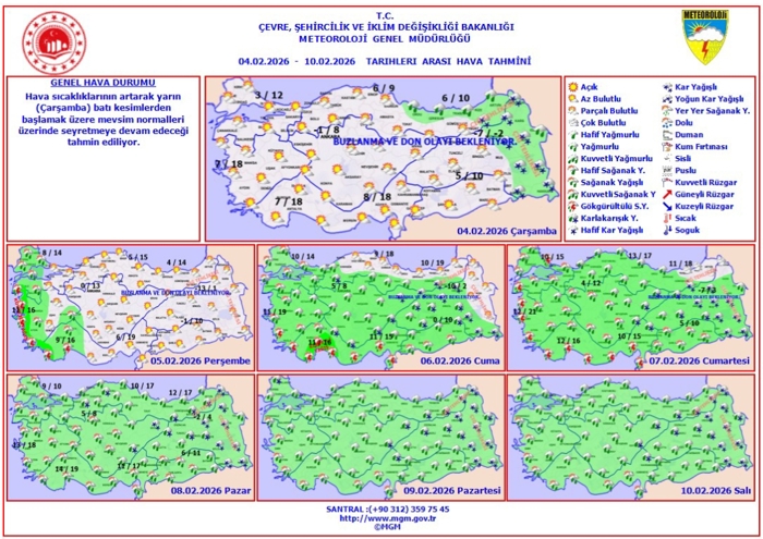 4 Şubat 2026 Çarşamba için Meteoroloji Genel Müdürlüğü olarak yapılan değerlendirmelere göre: Ülkemiz doğu kesimlerinin parçalı ve çok bulutlu, Doğu Karadeniz kıyıları, Doğu Anadolu'nun doğusu, Ordu ve Artvin çevreleri ile gece saatlerinden sonra Çanakkale çevreleri ve Balıkesir'in batı kesimlerinin yağışlı geçeceği tahmin ediliyor. Yağışların yağmur ve sağanak, Doğu Anadolu'nun doğusu ile Artvin çevrelerinde karla karışık yağmur ve kar şeklinde olması bekleniyor. Sabah ve gece saatlerinde doğu bölgelerde buzlanma ve don olayı bekleniyor. Doğu Karadeniz'in iç kesimlerinin yüksekleri ile Doğu Anadolu'nun doğusunda yüksek kar örtüsüne sahip eğimli kesimlerinde çığ tehlikesi bulunmaktadır.