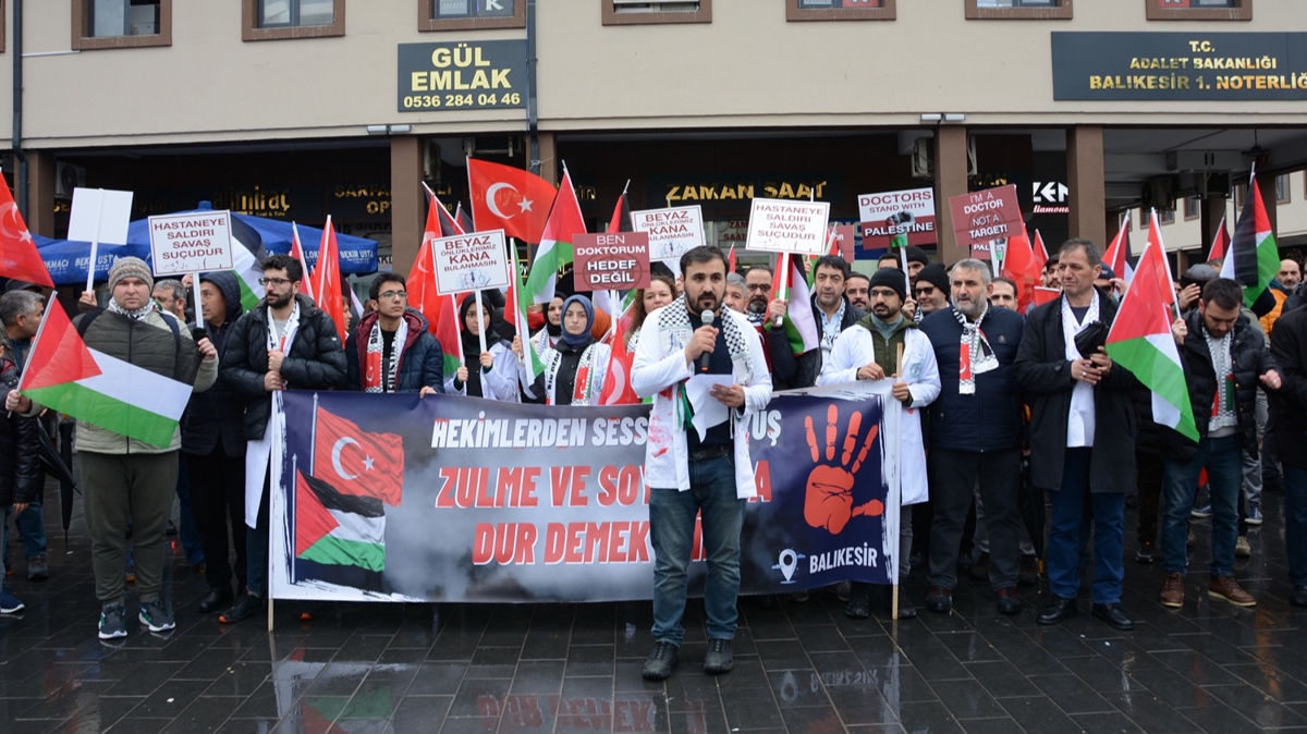 Bursa ve Balıkesir'deki hastanelerde görev yapan hekimler ve sağlık çalışanları, İsrail'in Gazze'ye saldırılarını protesto için sessiz yürüyüş yaptı.