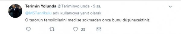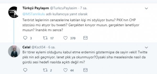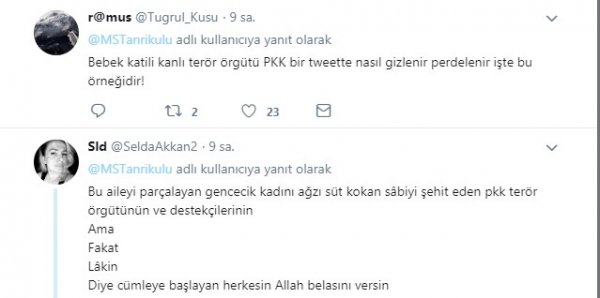 Örgütü sevindiren açıklamalara imza atan Tanrıkulu, Hakkari'nin Yüksekova ilçesinde teröristlerin asker eşini 11 aylık bebeğiyle katletmesinden sonra Twitter'dan terörü lanetlemek istedi.