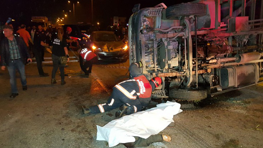 Kaza; 23.30 sıralarında D-100 karayolu Hal Kavşağı mevkiinde meydana geldi. Edinilen bilgilere göre; İstanbul istikametine gitmekte olan Serkan Piroğlu’nun kullandığı 81 AAP 722 plakalı otomobil aynı istikamete gitmekte olan Oktay Pala’nın kullandığı 81 FD 973 plakalı kamyona arkadan çarptı. Çarpmanın etkisi ile kontrolden çıkan kamyon orta refüje çıkarak elektrik direğine çarptıktan sonra karşı şeride devrildi. Bu sırada Ankara istikametine gitmekte olan Uğur Naroğlu’nun kullandığı 81 AAK 298 plakalı otomobil devrilen kamyona çarptı. Kazada otomobil sürücüleri Serkan Piroğlu ve yanında yolcu olarak bulunan Erdal Baş ile Uğur Naroğlu yaralandılar. Kamyon sürücüsü Oktay Pala ile yanında bulunan Tuncay Dönmez ise kamyonun şoför mahaline sıkıştılar. Düzce Belediyesi itfaiye Müdürlüğü ekipleri ve Düzce arama Kurtarma ekiplerinin çalışması ile sıkıştıkları yerden çıkarılan Oktay Pala kaza yerinde yerinde hayatını kaybederken, Tuncay Dönmez ise yaralı olarak sıkıştığı yerden çıkartıldı. Yaralılara olay yerinde acil sağlık ekipleri tarafından ilk müdahaleleri yapılırken, yaralılar ambulanslarla Atatürk Devlet Hastanesi ve Düzce Üniversitesi Hastanesi acil servisine kaldırılarak tedavi altına alındı.