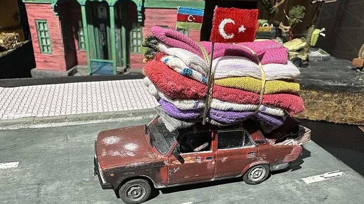 Karabük'te yaşayan orman işletme şefi Ferhat Karapınar, Kahramanmaraş merkezli depremlerin ardından Azerbaycanlı Server Beşirli'nin yardım malzemeleriyle doldurduğu eski aracını, diorama (üç boyutlu tablo, modelleme) tekniğiyle canlandırdı.
