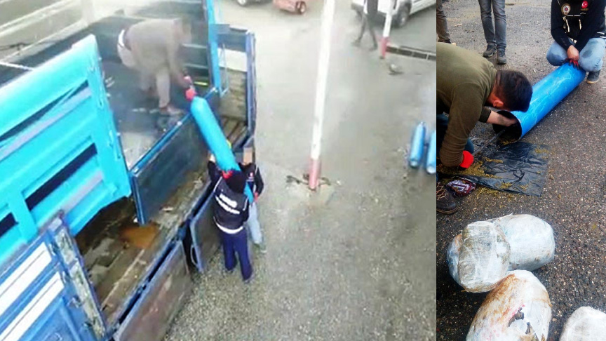 Kamyon kasasına yüklü halde bulunan traktör römorkunun içerisindeki 4 adet büyük oksijen tüpüne gizlenmiş uyuşturucu maddeyi kokuya duyarlı narkotik köpeği yardımıyla bulan ekipler, kamyonu emniyet bahçesine getirdi. Kaynak makinesiyle açılan tüplerin içerisinden 26 kilo 400 gram esrar maddesi çıktı. Olayla ilgili 3 kişi gözaltına alındı.