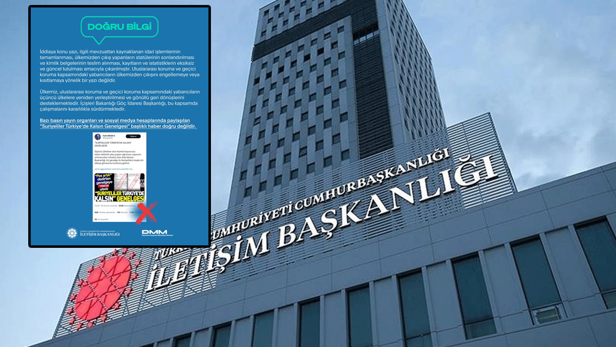 Cumhurbaşkanlığı İletişim Başkanlığı Dezenformasyonla Mücadele Merkezi, bazı basın yayın organları ve sosyal medya hesaplarında paylaşılan “Suriyeliler Türkiye'de Kalsın Genelgesi” başlıklı haberin doğru olmadığını duyurdu.