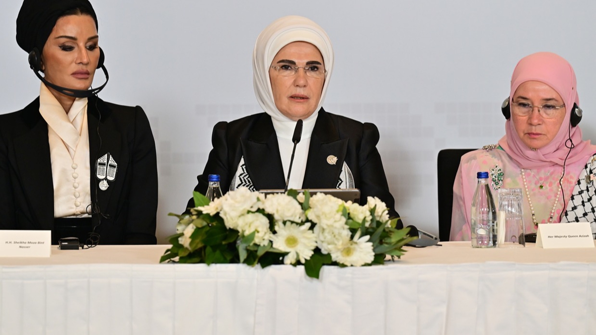 Emine Erdoğan, "Bu tarihi buluşmanın Filistin ve bölgemizdeki barış ve huzurun tesisi için bir vesile olmasını diliyorum. Zirvenin bir sonucu olarak bugün İstanbul'dan tüm dünyaya şu ortak çağrıyı yapıyoruz. Bizler, dünyanın farklı ülkelerinden devlet ve hükümet başkanlarının eşleri ve ülke temsilcileri olarak Gazze'deki insani krize uluslararası toplumun dikkatini çekmek ve bilhassa çocuklar, kadınlar, hastalar ve engelliler olmak üzere sivillerin yaşadığı trajedinin sonlandırılması, kalıcı ve adil bir barışın tesisi, uluslararası kamuoyunun insanlığa karşı suç sayılabilecek bu saldırılar karşısında harekete geçmesini sağlamak amacıyla 15 Kasım 2023'te İstanbul'da bir araya geldik. Bizler, 7 Ekim 2023 tarihinden bu yana yaşanan çatışmalar nedeniyle Gazze ve Doğu Kudüs dahil olmak üzere işgal altındaki Filistin topraklarında yaşanan insani trajediden derin bir endişe duyuyoruz. Gazze'ye uygulanan ve uluslararası hukuk ile bağdaşmayan abluka ve ambargonun sebep olduğu insani krizin sivillerin temel ihtiyaçlara erişimine engellediğine ve tam bir insan hakları ihlaline dönüştüğüne dikkat çekiyoruz. 7 Ekim'den bu yana Gazze'de yaşanan trajedide çoğunluğu çocuk ve kadın olmak üzere 11 binden fazla sivilin katledilmesinin uluslararası hukukun en ağır ihlallerinden birini teşkil ettiğini vurguluyoruz. Gayri insani koşullar altında bulunan ve katliam tehdidiyle karşı karşıya kalan hamile kadınların, çocukların, bebeklerin ve hastaların can güvenliğinin bir an önce sağlanması amacıyla acil eyleme geçilmesi gerekliliğini işaret ediyoruz" dedi.
