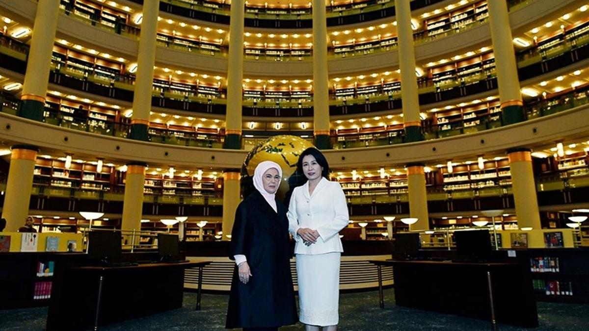 Kütüphanenin Cihannüma Salonu'na geçen lider eşleri, Güney Kore Kitaplığı'ndaki eserleri inceledi.