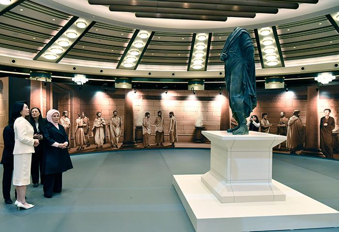 Cumhuriyet tarihinin en kapsamlı arkeoloji projesi "Geleceğe Miras" kapsamında yapılan kazılarla bulunan eserlerin yer aldığı "Arkeolojinin Altın Çağı Sergisi"ni de gezen Emine Erdoğan ve Kim, Roma İmparatoru Marcus Aurelius'un bronz heykelin de yer aldığı sergideki eserleri yakından inceledi.