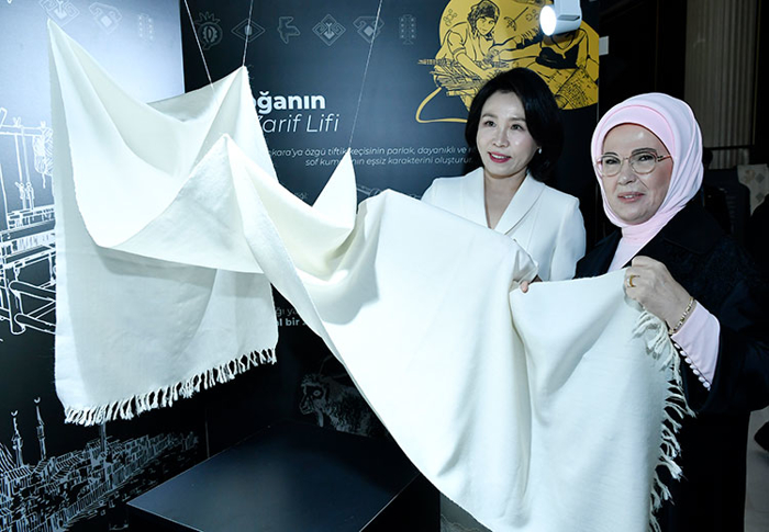 Ankara Valiliğince patenti alınan sof kumaşından yapılan ürünleri yakından inceleyen Kim, kumaşları çok beğendiğini dile getirdi.