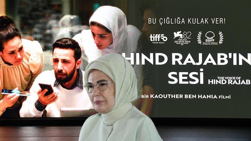 Emine Erdoğan, yönetmenliğini ve senaristliğini yönetmen Kaouther Ben Hania'nın üstlendiği Gazze'de İsrail ateşi altında bir araçta mahsur kalarak hayatını kaybeden 6 yaşındaki Filistinli Hind Rajab'ın hikayesini anlatan "Hind Rajab'ın Sesi" filmini "boğazında düğümlenen acıyla" izlediğini ifade etti.