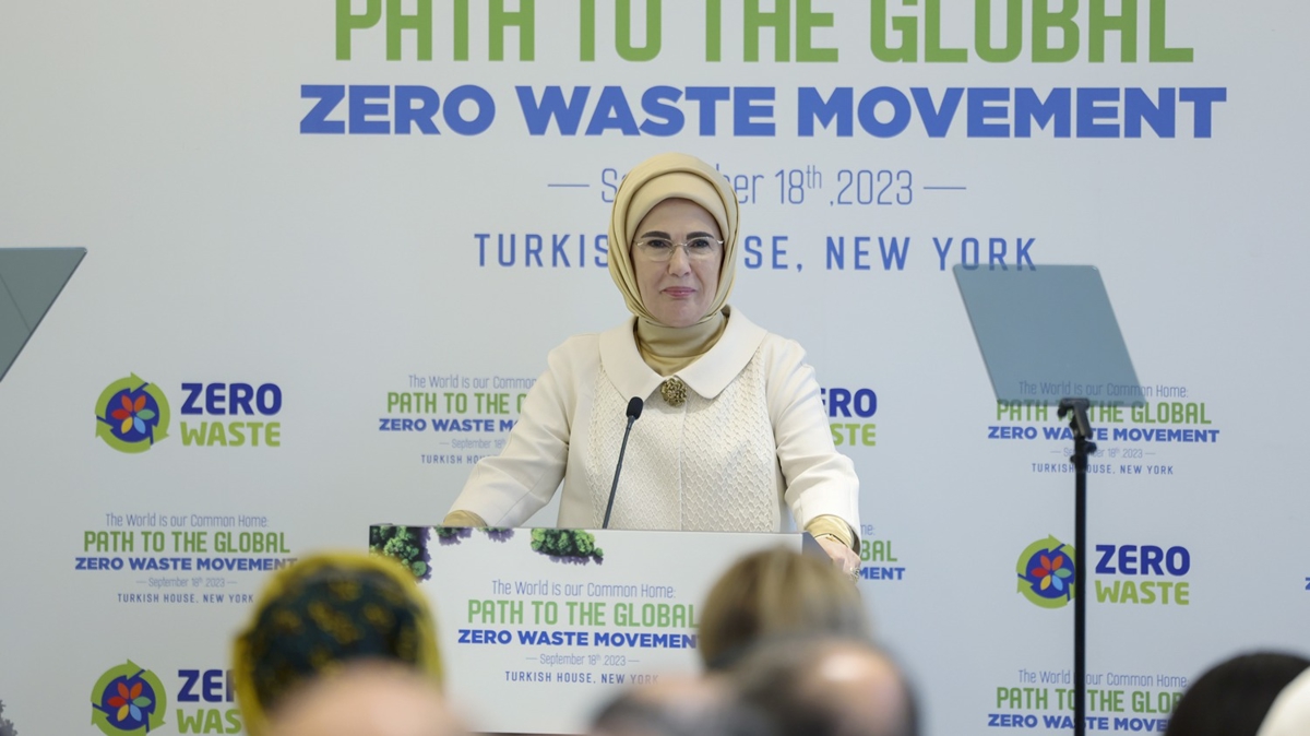 Cumhurbaşkanı Recep Tayyip Erdoğan'ın eşi Emine Erdoğan, New York'ta sıfır atık konusunda tüm dünyayı gönüllü olmaya davet ederek, 'Bugün, ülkemde ektiğimiz sıfır atık tohumunun gölgesinin, dünyayı ferahlatacak bir çınara dönüşmesine tanıklık ediyoruz.' dedi.