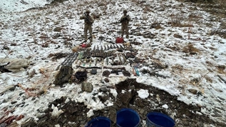 Eren Abluka Sonbahar-Kış-5 Operasyonu kapsamında, Hakkari'de toprağa gömülü olarak tespit edilen 9 AK-47 piyade tüfeği, 8 roketatar sevk fişeği ve 13 el bombası ile çok sayıda mühimmat imha edildi.