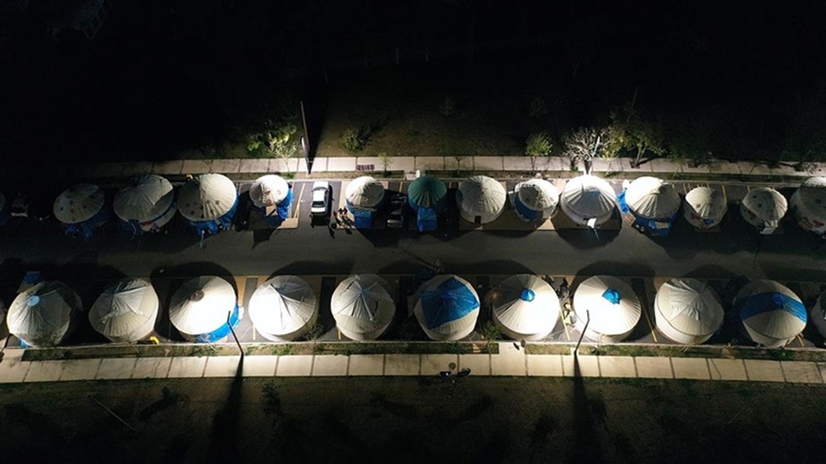 "Burada Avşar'da üniversite kampüsü içerisinde yaklaşık 200 çadırın kurulumunu tamamlıyoruz. Diğer yer göstermelerle birlikte 2 binin üzerinde çadır ve yeni yaptığımız çadırlarda, çadırların içerisinde ıslak zeminlerde duşu, tuvaleti ve mutfak tezgahıyla birlikte yaptığımız için aslında bu çadırlar sizde gördünüz içerisinde ıslak zemin olduğu zaman konteynerden daha konforlu. Hem iç hacmi büyük olduğu için hem de metrekaresi büyük olduğu için içerideki aileler de 'burada ıslak zemin olduktan sonra konteynere niye gidelim ki?' boyutunda beğeniyorlar."