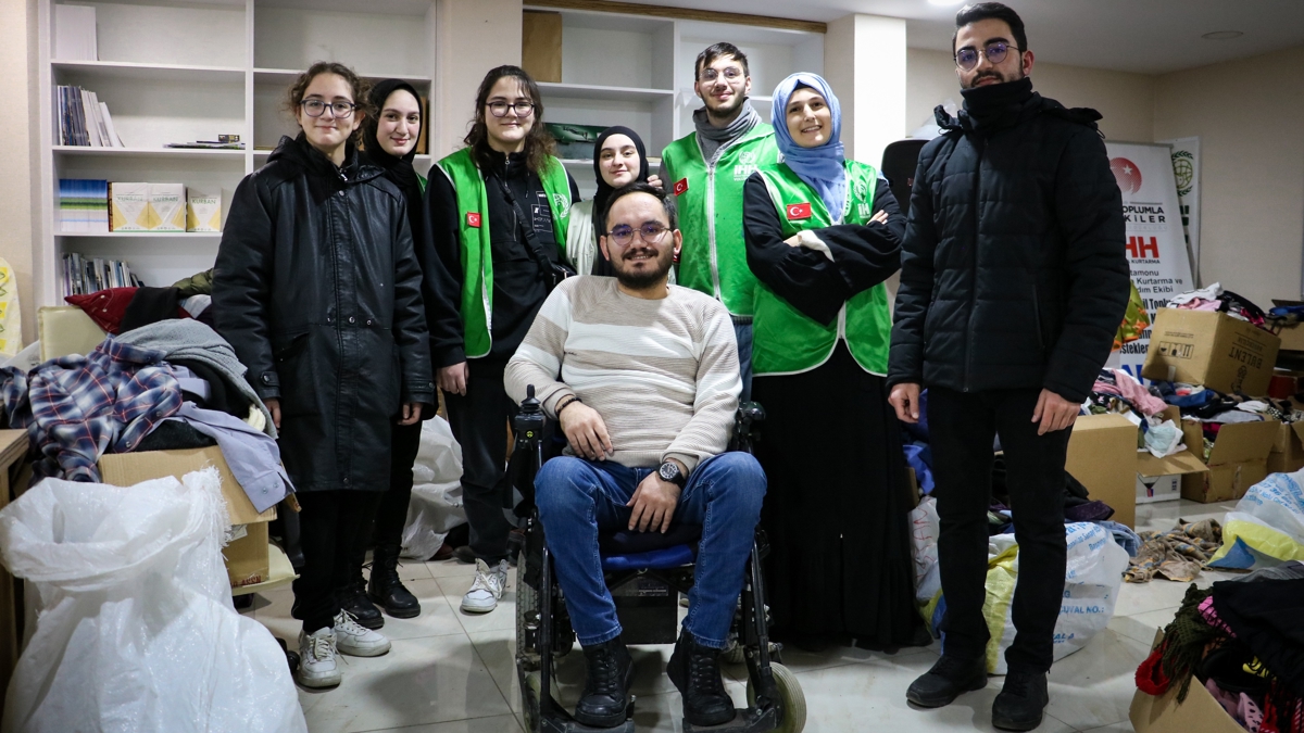 Kastamonu'da yaşayan ve halk arasında kas erimesi olarak bilinen Limb Girdle Musküler Distrofi hastası veteriner hekim Mustafa Okumuş, yardım kuruluşu İHH'de gönüllü olarak görev alarak yardımları paketliyor.