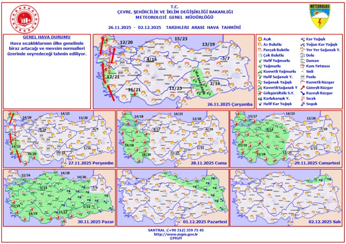 26 Kasım 2025 Çarşamba günlük hava durumunu merak edenler toplansın. Meteoroloji Genel Müdürlüğü yeni hava tahmin raporunu paylaştı. Meteoroloji, kuvvetli sağanak yağış ve rüzgar için şehir şehir uyarıda bulundu. Öte yandan sıcaklıkların bir kaç derece artacağını ve mevsim normalleri üzerinde seyredeceğini duyurdu. İşte, Meteorolojiden şehir şehir uyarılarla birlikte günlük hava durumu raporu karşınızda...