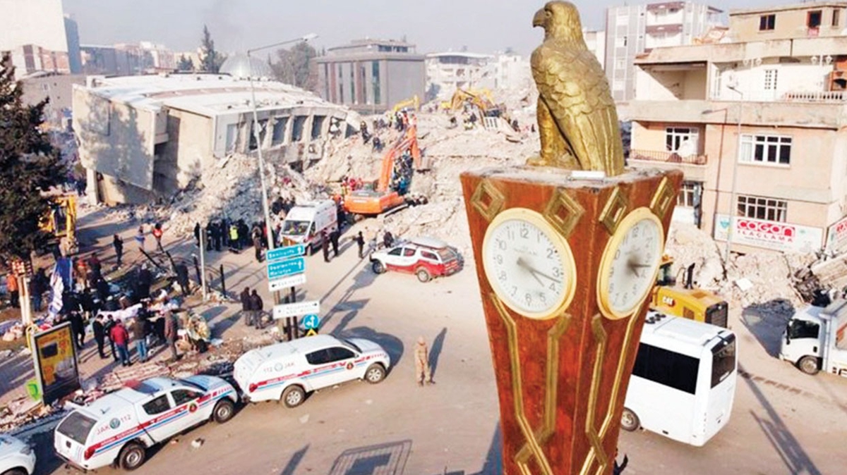 Depremin vurduğu Adıyaman'da, şehir merkezinde neredeyse tüm binalar yıkıldı ancak 40 yıllık saat kulesi enkazların arasında dimdik ayakta durdu. Kartal figürlü kulenin tarihi saati de depremin yaşandığı 04.17'yi göstermeyi sürdürüyor.