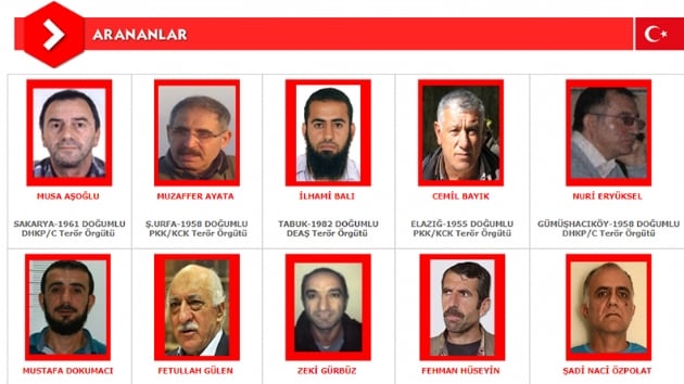 Listenin 4 milyon lira ödülle aranan teröristlerin bulunduğu ‘kırmızı’ kategorisinde, 98’si PKK, 42’si FETÖ, 12’si DEAŞ olmak üzere 184 isim yer alıyor. ‘Kırmızı’ kategoride yer alan FETÖ’cülerin başında elebaşı Fetullah Gülen bulunuyor. Ayrıca Mustafa Özcan, Abdullah Aymaz, Şerif Ali Tekalan, İsmail Büyükçelebi, Naci Tosun, Cevdet Türkyolu ve Cemal Türk gibi örgütün beyin takımının da yer aldığı kategoride, FETÖ’nün TSK imamı Adil Öksüz ile 15 Temmuz darbeci girişiminin firari cuntacıları da yer alıyor.
