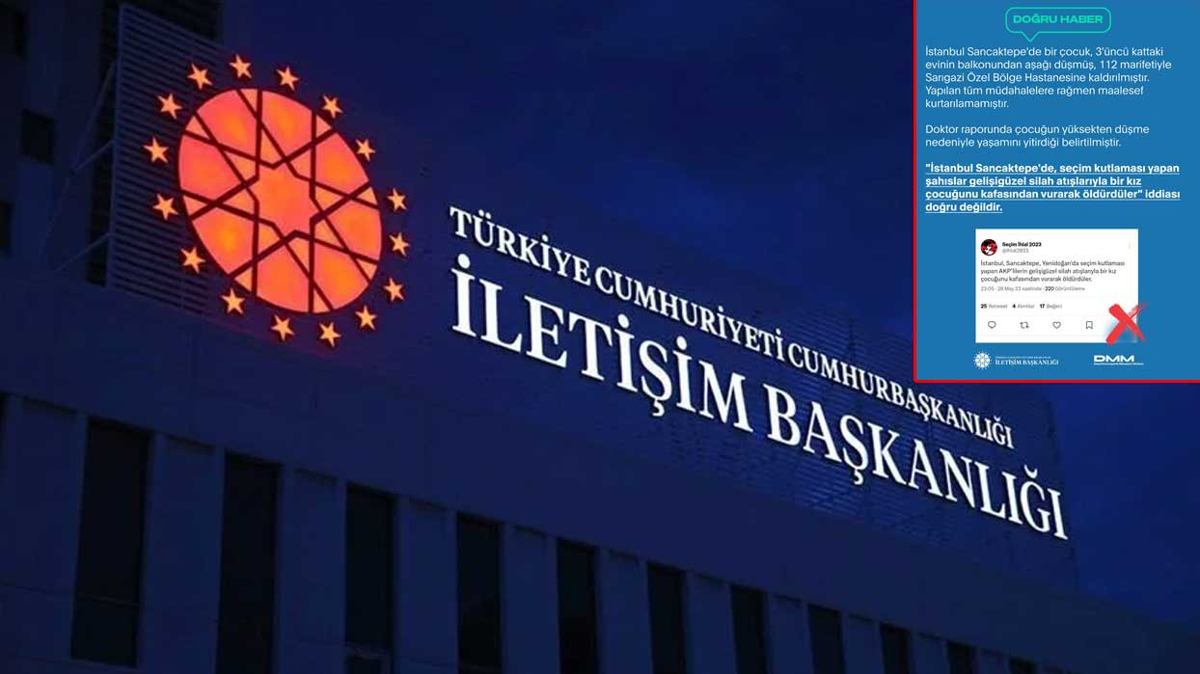 İletişim Başkanlığı, sosyal medyada ve bazı basın yayın organlarında yer alan "İstanbul'da, seçim kutlaması yapan şahıslar gelişigüzel silah atışlarıyla bir kız çocuğunu vurarak öldürdüler" iddiasının gerçeği yansıtmadığını açıkladı. Dezenformasyonla Mücadele Merkezi tarafından yapılan açıklamada, "Bahse konu olayda, bir çocuk 3'üncü kattaki evinin balkonundan düşmüş, hastanede yapılan tüm müdahalelere rağmen maalesef kurtarılamamıştır." ifadelerine yer verildi.