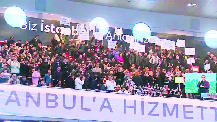 İmamoğlu, "Bir dakika arkadaşlar. Kulağınız bende olsun. Anlaşalım bir dakika sevgili arkadaşlar ayıp ediyorsunuz, oturun beni dinleyin" diyerek sloganlara tepki gösterdi.