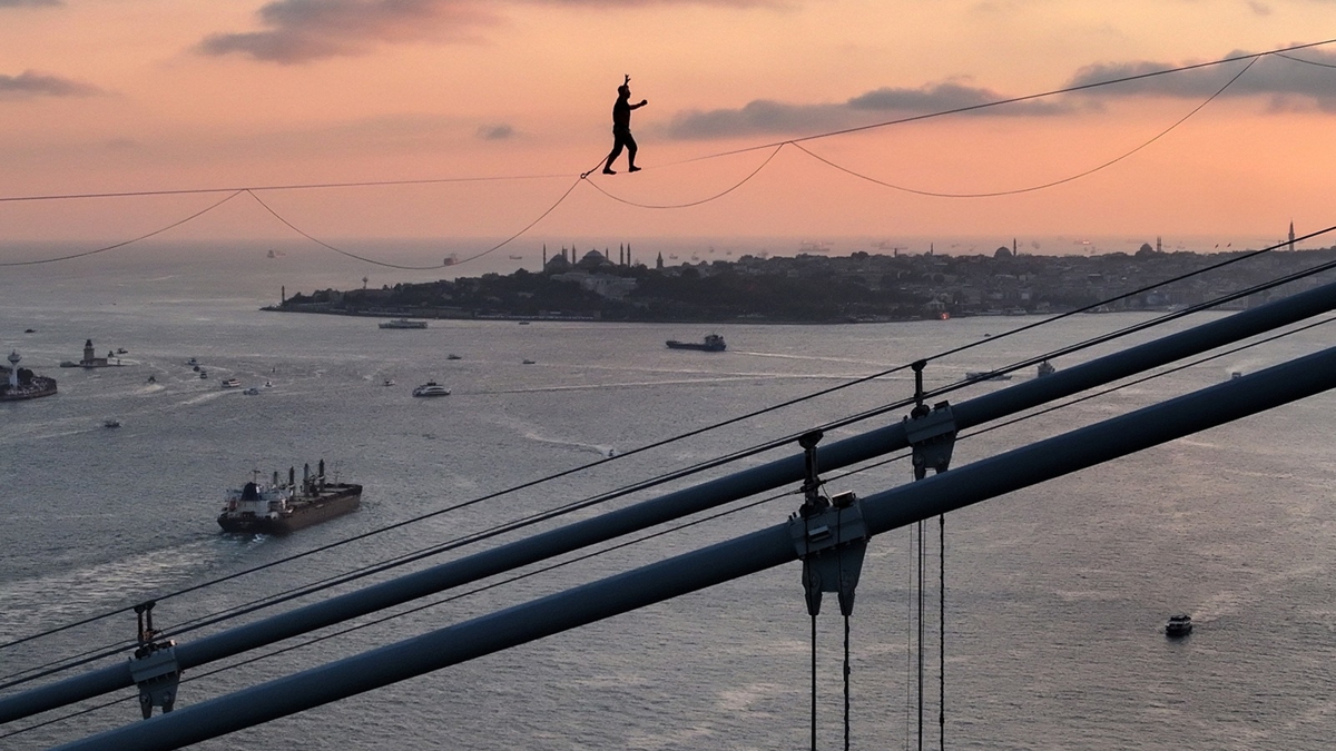 Estonyalı akrobat Jaan Roose, İstanbul Boğazı'nda 15 Temmuz Şehitler Köprüsü üzerinde Asya'dan Avrupa'ya ip üstünde yürüyerek geçti.