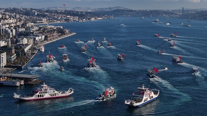 Galata Köprüsü çevresinde bulunan birçok gemi, Türk ve Filistin bayraklarıyla süslendi. Eyleme destek için gemilerden sirenler çalındı.