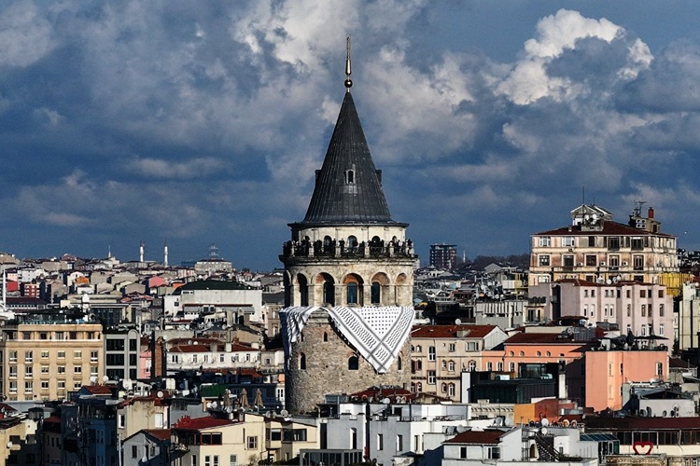 İstanbul'un simge yapılarından Galata Kulesi'ne, Gazze'deki soykırıma dikkati çekmek amacıyla Filistin kefiyesi asıldı.