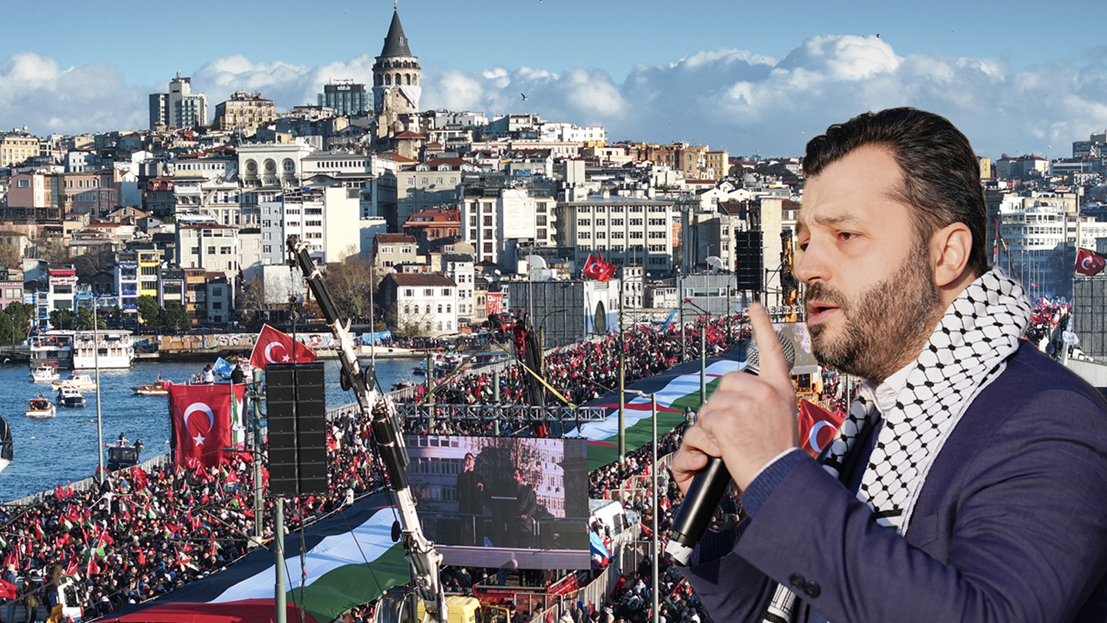 Galata Köprüsü'nün farklı şehirlerden, dillerden, hayatlardan katılanlarla bugün vicdan kürsüsüne dönüştüğünü söyleyen Beşinci, "Bu aziz kürsüden masum ve cesur Filistin halkını, Gazze'nin soylu evlatlarını, Batı Şeria'nın mücahit yüreklerini, Doğu Kudüs'ün gerçek sahiplerini, tüm benliğimle selamlıyorum." ifadelerini kullandı.