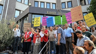 Kadıköy Belediyesi önünde toplanan işçiler, ellerinde "ek protokol istiyoruz" ve "faturaları ödeyemiyoruz" yazılı dövizler taşıyarak, sloganlar attı.