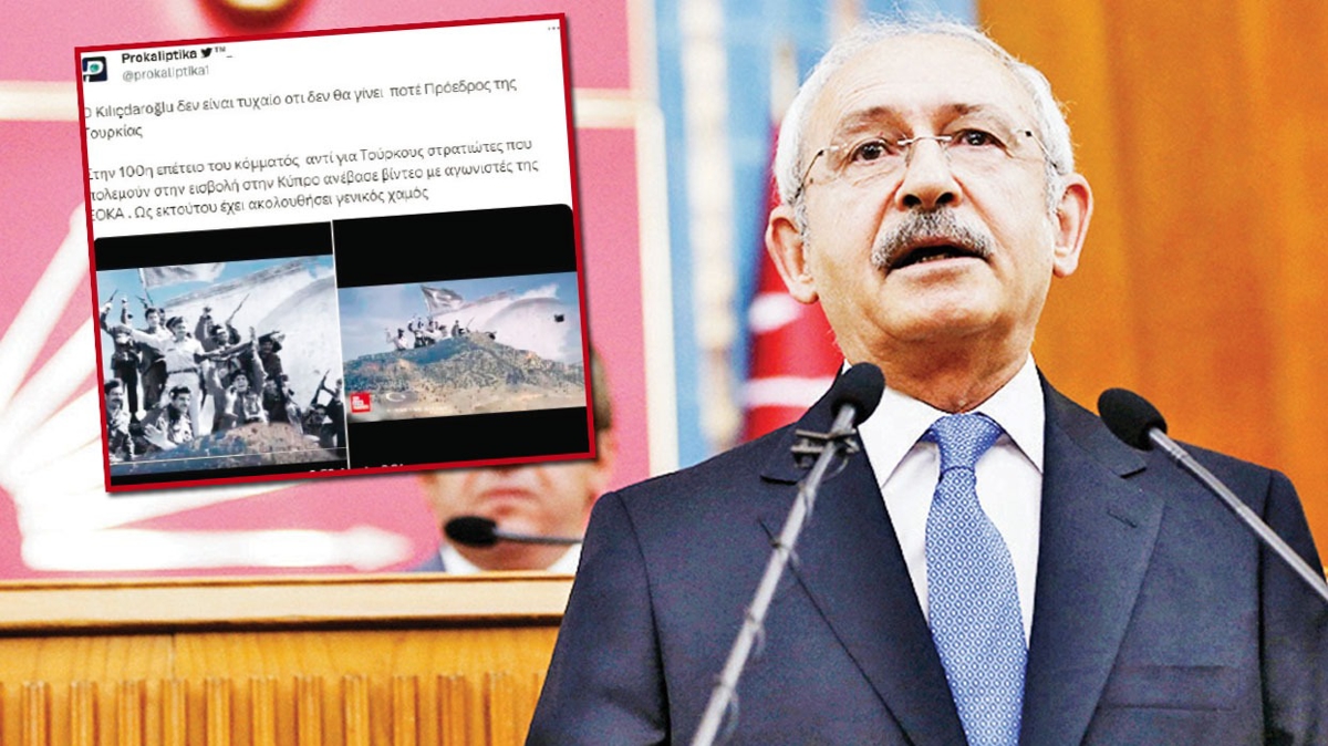 CHP Genel Başkanı Kemal Kılıçdaroğlu'nun, partisinin 100'üncü yılı için hazırlanan videoda Kıbrıs'taki Türk mücahitler diye, Türk bayrağını ele geçiren EOKA'lı teröristlerin fotoğrafını kullanması tepki çekti. Kemal Kılıçdaroğlu'nun, "Biliyoruz ki umut, halkın egemenliği... Cumhuriyet Halk Partimizin 100. yaşı kutlu olsun!" diye paylaştığı videoda, EOKA'lı teröristlerin yer alması Yunanistan'da da gündem oldu.