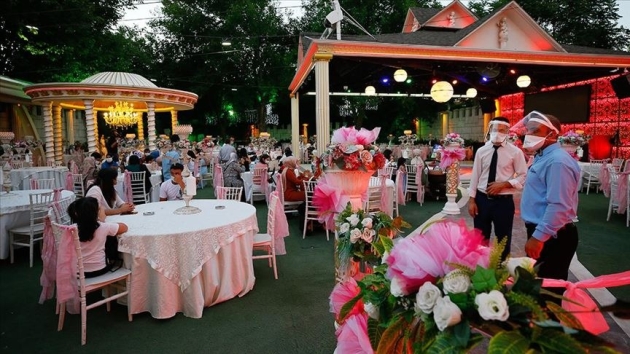 Alınan tedbirlere uyan düğün salonlarının 1 Temmuz'dan itibaren hizmet vermeye başladıklarına işaret edilen açıklamada, düğün nişan, sünnet düğünü gibi etkinliklerin en kısa sürede tamamlanmasının benimsendiği vurgulandı.