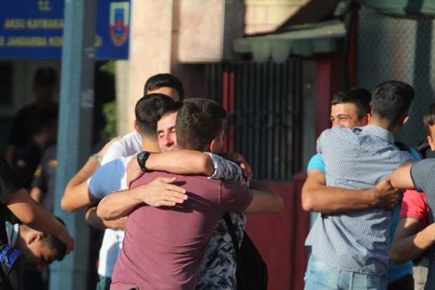 Antalya'nın Aksu İlçe Jandarma Komutanlığı'nda vatani görevini yapan ve 6 ayını dolduran askerler bugün terhis edildi. Son iştimasını veren askerler daha sonra valizlerini topladı. Komutanları ve geride kalan arkadaşlarıyla vedalaşan askerler mutlu bir şekilde birliklerinden dışarı çıktı. Hepsinin yüzünden mutluluk gözlenen askerler komutanlık önünde özçekim yapmayı da ihmal etmedi. Askerler hep bir ağızdan' En büyük jandarma' dedikten sonra birbirleriyle vedalaşıp, evlerinin yolunu tuttu.